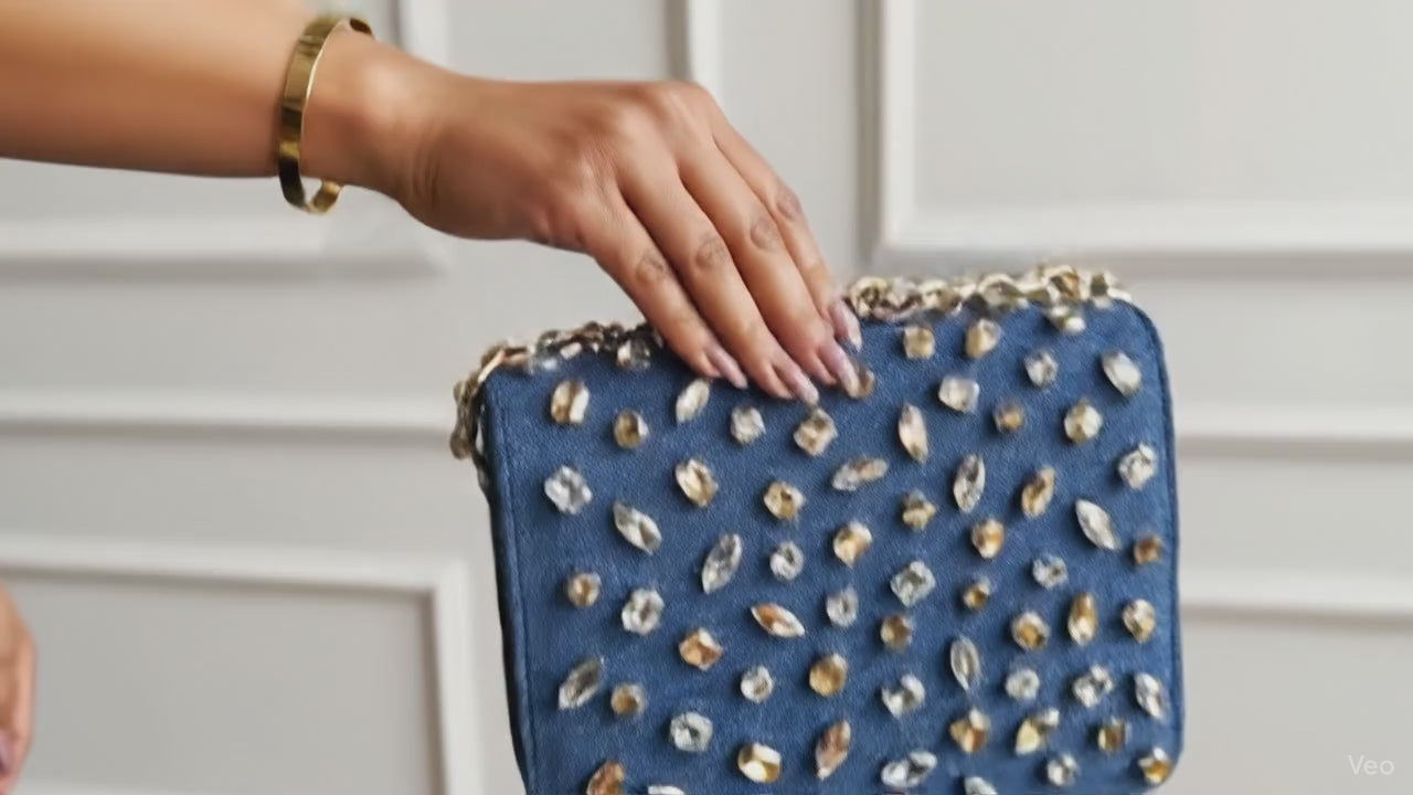 Hand-embellished with crystals, these denim flap bags are the perfect blend of chic and bold. Comes with a stylish sling chain for easy carry. 💎👜